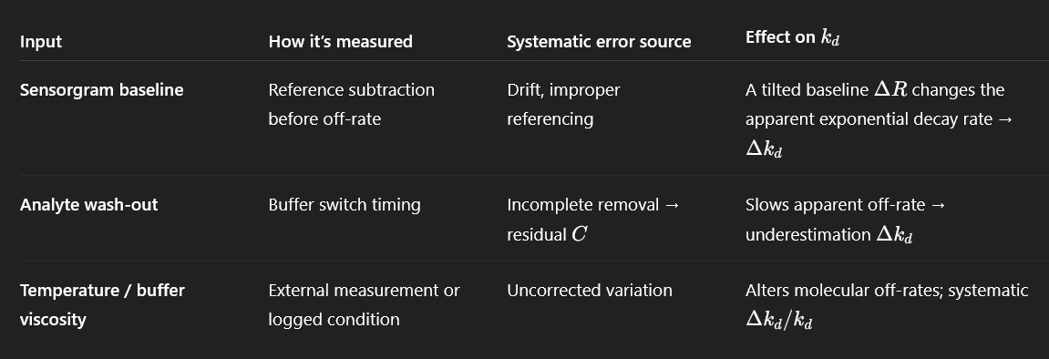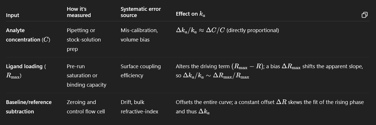 - In certain cases for SPR, the has a theoretical value based upon the density of ligand on the sensor and molecular weights - in such cases, is a fixed value = ERRORS WILL PROPAGATE IN THIS CASE because factors such as baseline draft or improper ligand loading will cause systematic errors in the responses produced.